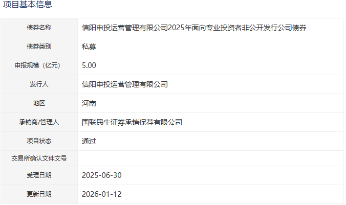 【大河财立方消息】1月13日消息,信阳申投运营管理有限公司2025年面向专业投资者非公开发行公司债券项目获深交所通过。债券拟发行金额5亿元,承销商/管理人国联民生承销保荐。